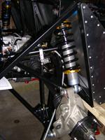 Seeing as the shocks have turned up I thought I'd fit the rears - so i fitted the springs to the shocks and mounted them to the chassis and the wishbones. These are so stiff that if I attempt to compress by hand, i end up picking up the whole car! The rear-end is looking really good now, ready for the wheel to be put on and the geometry set up, but i think i'll get the front up to speed first. Oh... and not forgetting the rear calipers which still aren't here!!