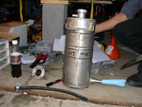 Next I decided to fit the oil breather catch tank that turned up today. Its a very nice polished alloy one with three connector nipples. The top two connect beautifully onto the top of the gearbox and the top of the sump tank. The third is situated at the bottom and is presumably designed to drain the tank if it fills - I stuck a hose on this and gave blew into it as hard as I could. Air then rushed back at me, proving that (to some extent) its sealed. This is a problem because it is supposed to be a breather tank! To solve this I drilled a small hole in the top of the tank. Hopefully that's correct....! Finally, i left a couple of inches of hose on the lower tank, shoved a bolt up the end and jubilee clipped it closed.